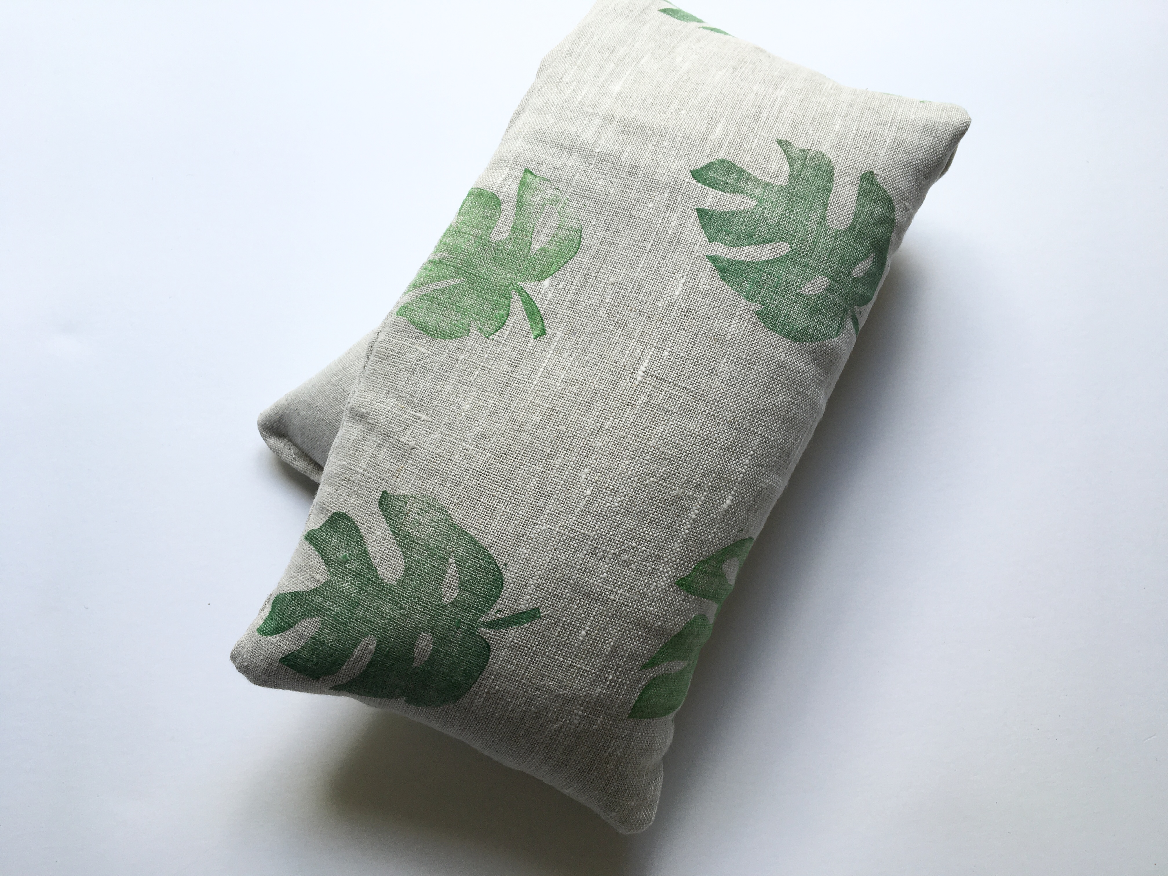 This fun patterned Aromatherapy pillow is block printed with Monstera leaves in different shades of tropical green on flax colored linen.
