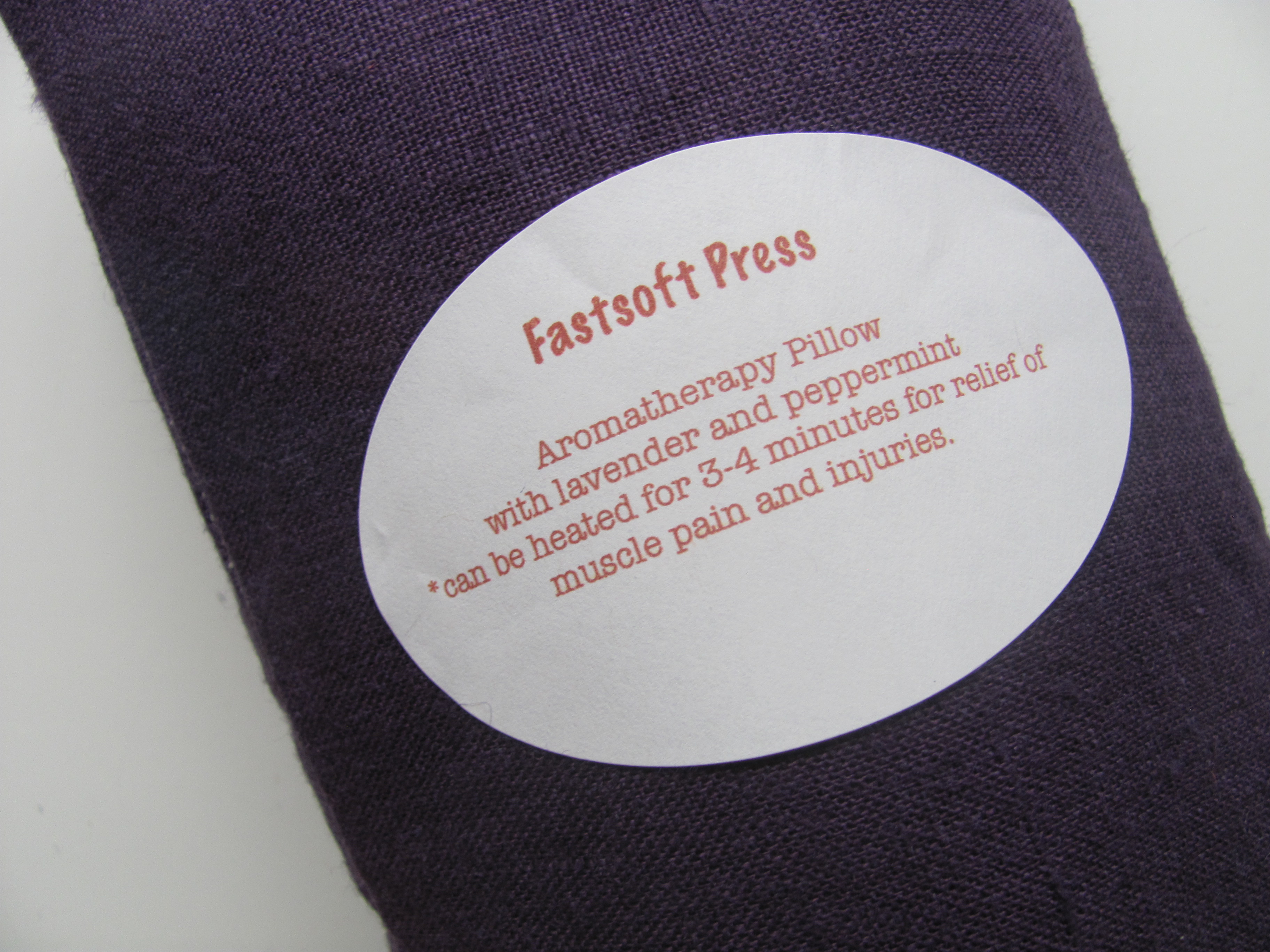 Fastsoft Press Large Aromatherapy pillows are approximately 6″ X 21″ long and contain a blend of peppermint, lavender, and flaxseed. They are meant to be heated in the microwave between 3-4 minutes, remaining hot for up to an hour and providing moist hot therapy/relief for muscles aches and stiffness, sports injuries, and menstrual cramps.