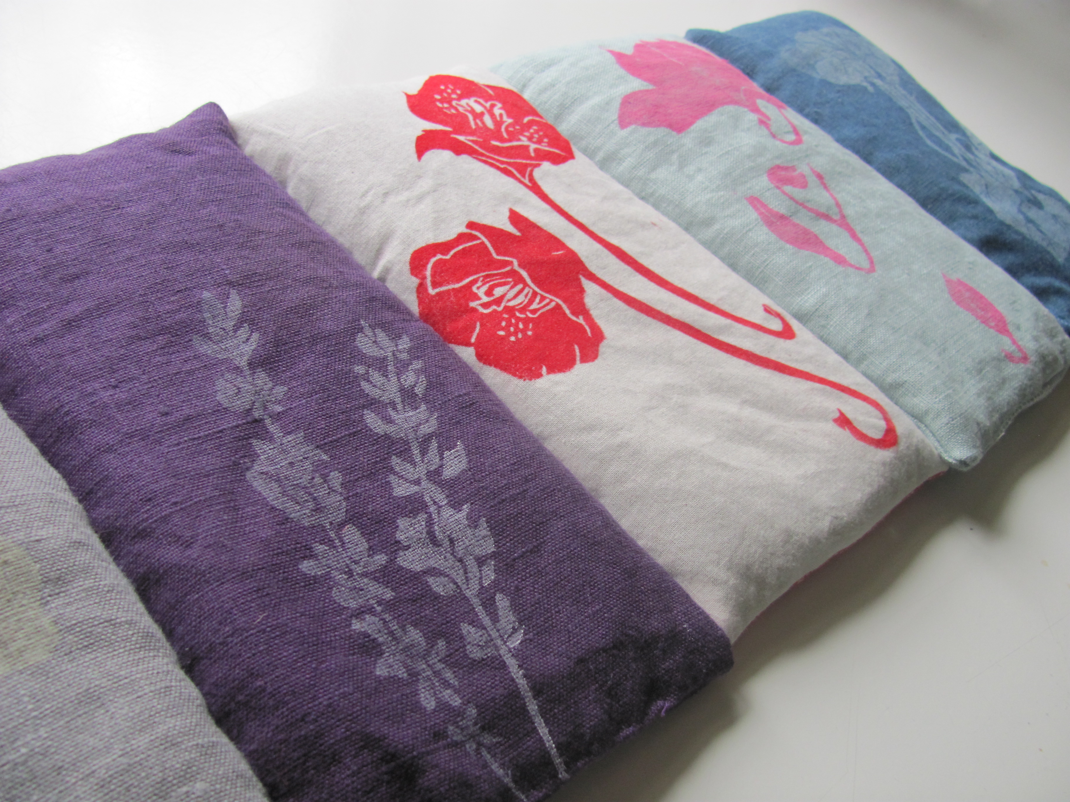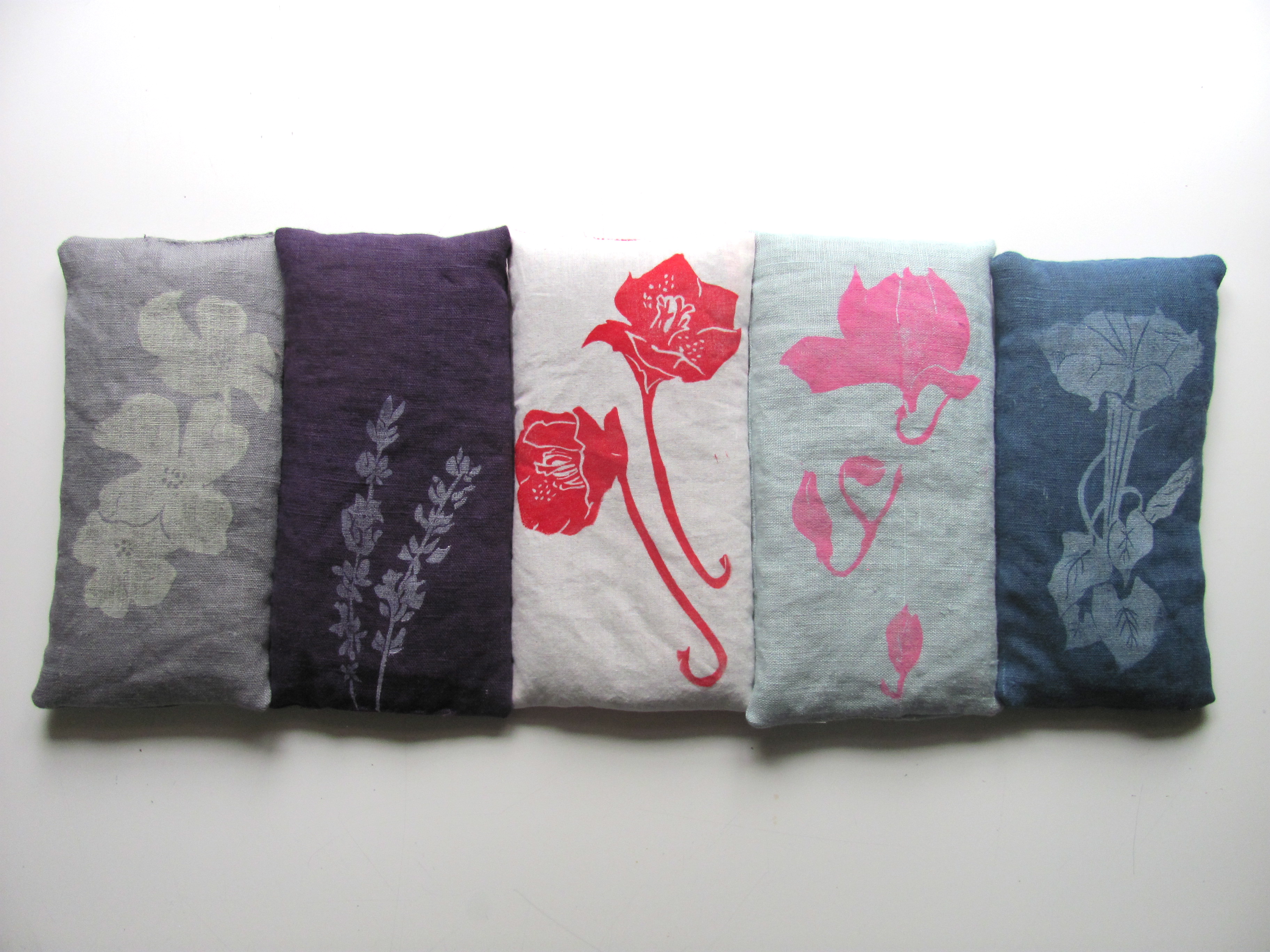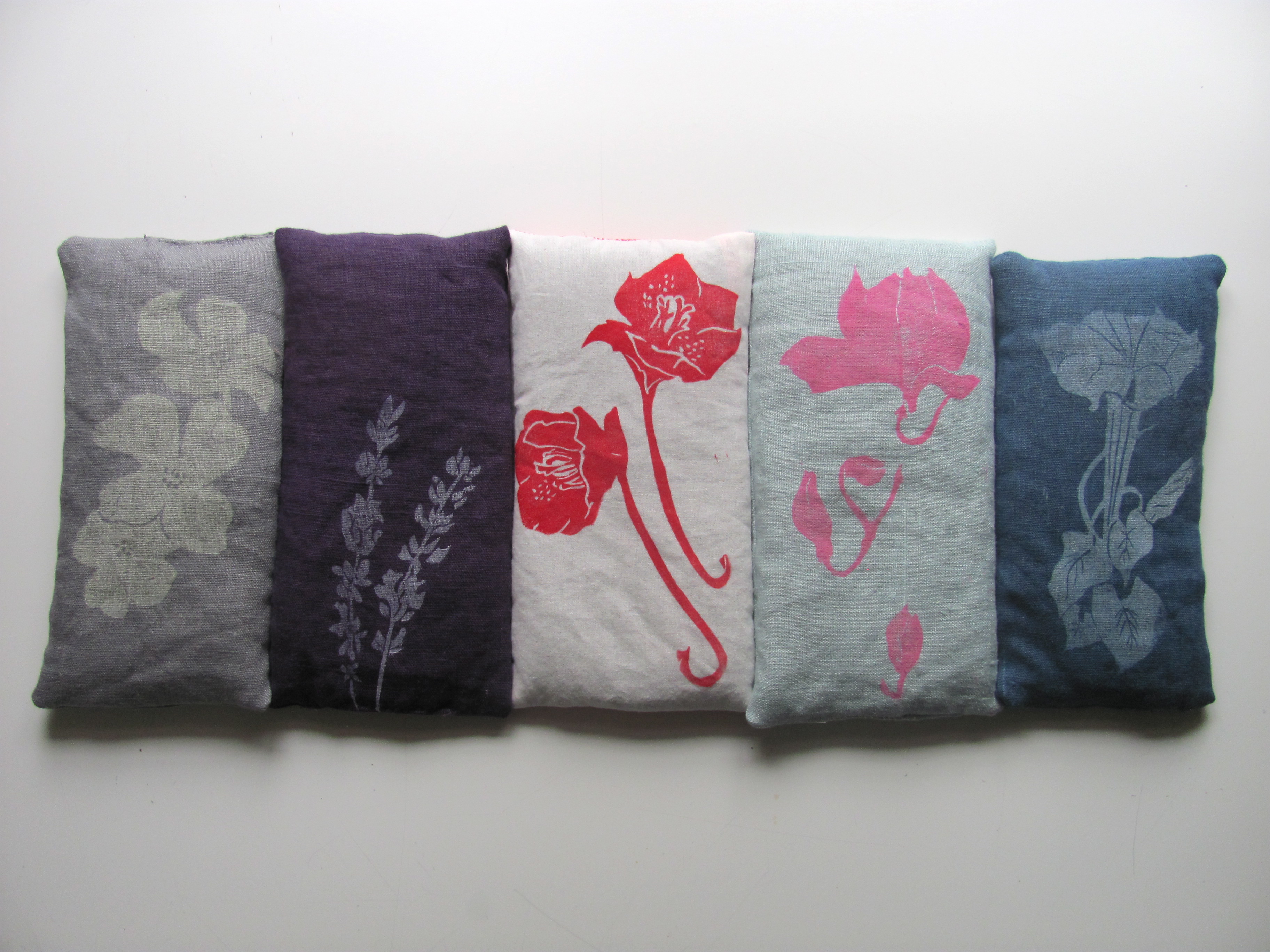 Fastsoft Press Lavender Eyepillows are hand-printed from carved linoleum blocks and feature a variety of original botanical designs .Made from linen and linen/cotton combinations, each eyepillow is hand-filled with a blend of flaxseed and and lavender. They can be heated or refrigerated to provide relief from tension/migraine headaches, insomnia, stress, as well as soothing tired eyes.