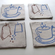 Each coaster set includes 2 teacup coasters and 2 teabag coasters.  The teabag coasters are printed with a small steaming cup and the teabag coasters feature two dripping teabags-one printed in brown and the other in blue. They make a fun set and are sure to entertain!