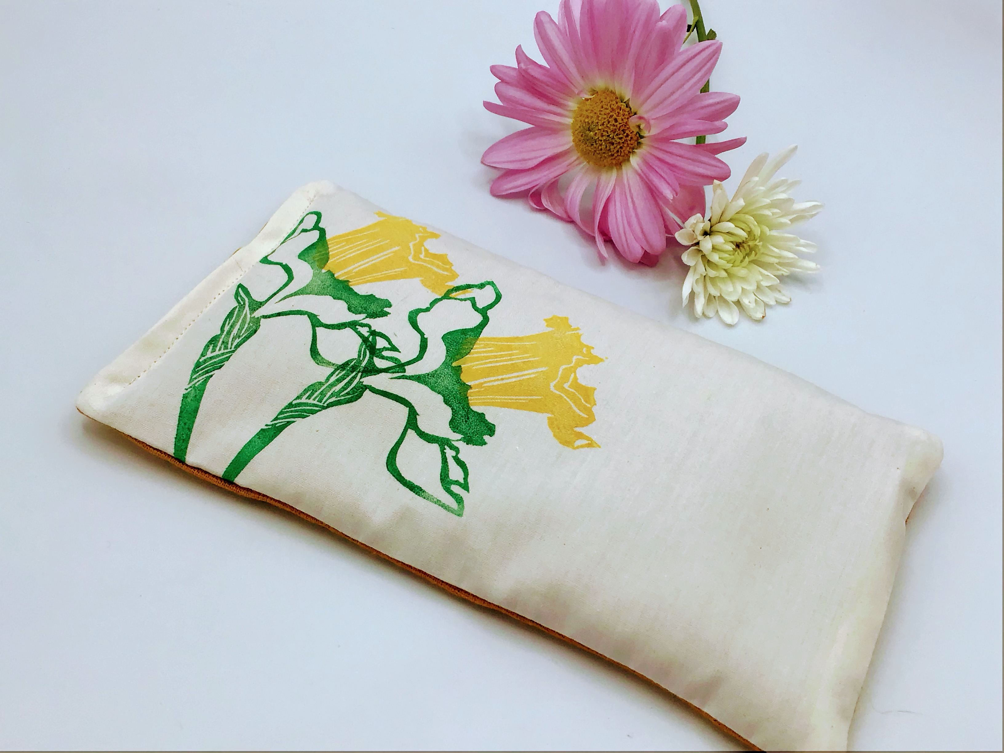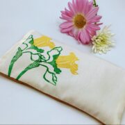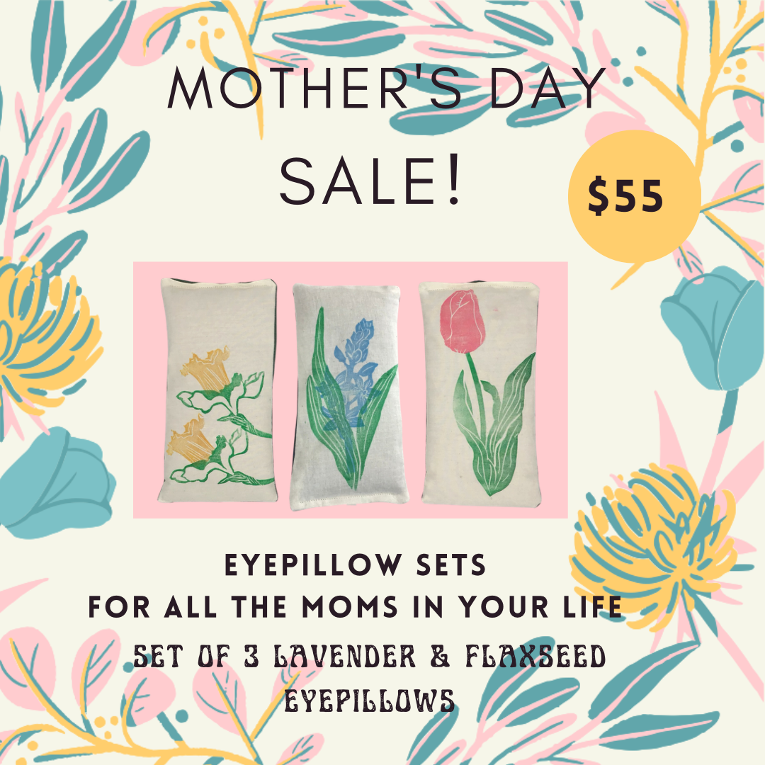 This Mother’s Day gift set features 3 Handprinted Lavender and flaxseed eyepillows. Each eyepillow is made from a blend of 100% cotton and Linen and filled with a custom blend of flaxseed and essential Lavender oil. This set includes a Daffodil flower pillow, a Hyacinth flower pillow, and a Tulip eyepillow.